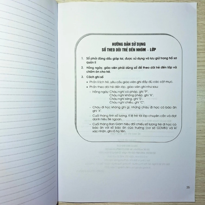 Cuốn sổ được thiết kế rõ ràng, dễ sử dụng, giúp giáo viên quản lý thông tin điểm danh theo ngày, theo tháng và theo năm học. Các cột mục được trình bày hợp lý, thuận tiện cho việc tổng hợp số liệu, theo dõi tình hình chuyên cần của trẻ cũng như báo cáo với Ban giám hiệu, phụ huynh và các cơ quan chức năng khi cần.