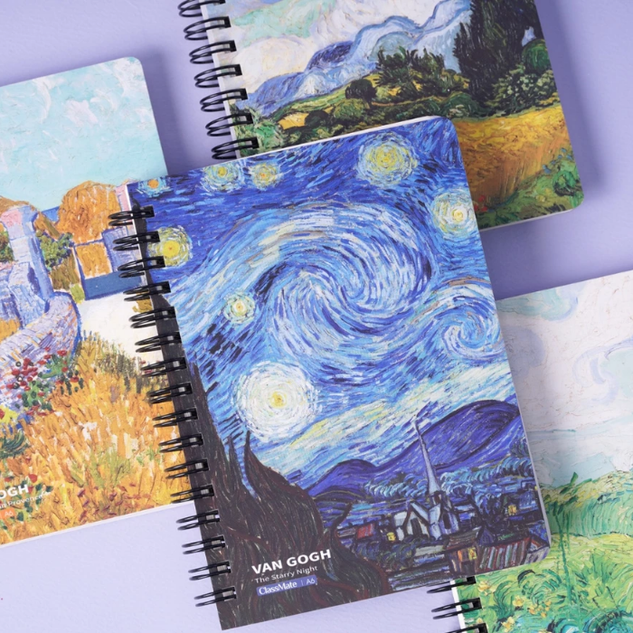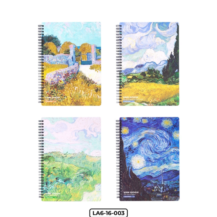 - Sổ tay được thiết kế lò xo an toàn, màu sắc bìa sổ đa dạng, in hình tác phẩm vẽ nổi tiếng của họa sĩ VanGogh, hình in sắc nét, bắt mắt.