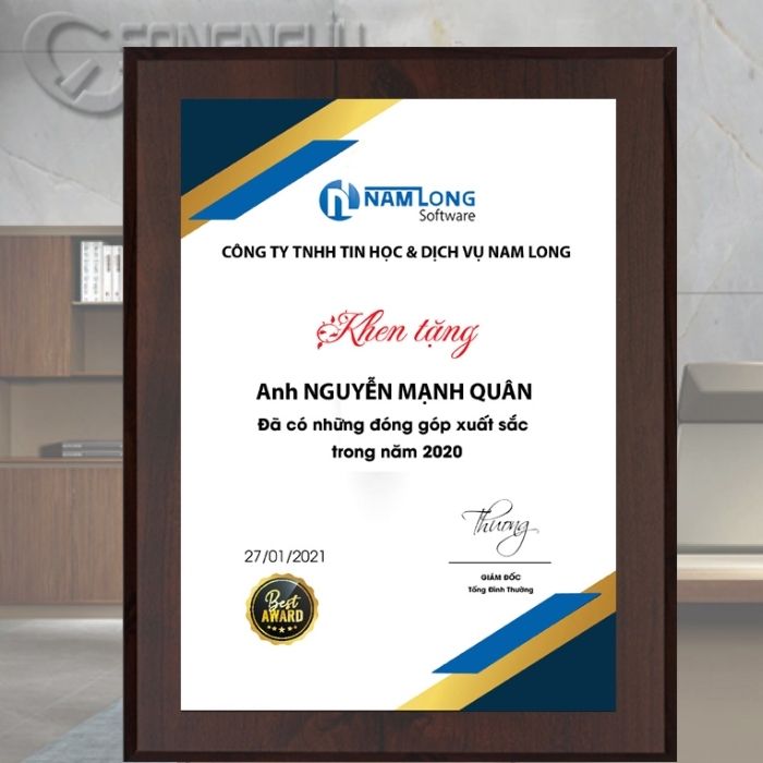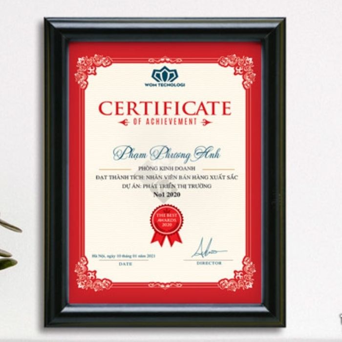 Giấy Khen Nhân Viên Xuất Sắc là ấn phẩm vinh danh những cá nhân có thành tích nổi bật và đóng góp tích cực trong công việc. Với thiết kế sang trọng, tinh tế cùng chất liệu in cao cấp, sản phẩm giúp tôn vinh giá trị nhân sự, lan tỏa tinh thần cống hiến và tạo động lực phát triển trong doanh nghiệp.