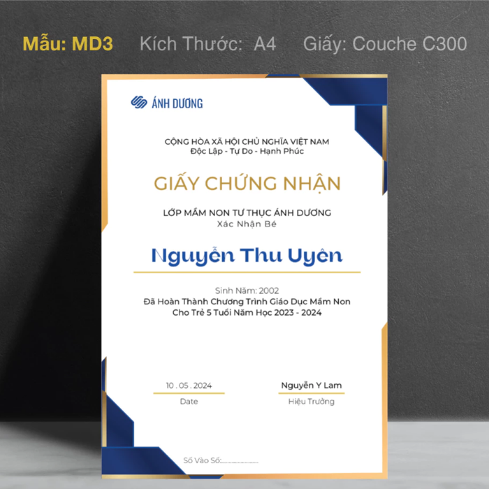 Mẫu chứng nhận mầm non sử dụng chất liệu giấy coucher C300 dày dặn, kích thước khổ A4 phù hợp với các khung treo bằng hiện tại và thay logo thông tin nội dung theo yêu cầu của khách hàng