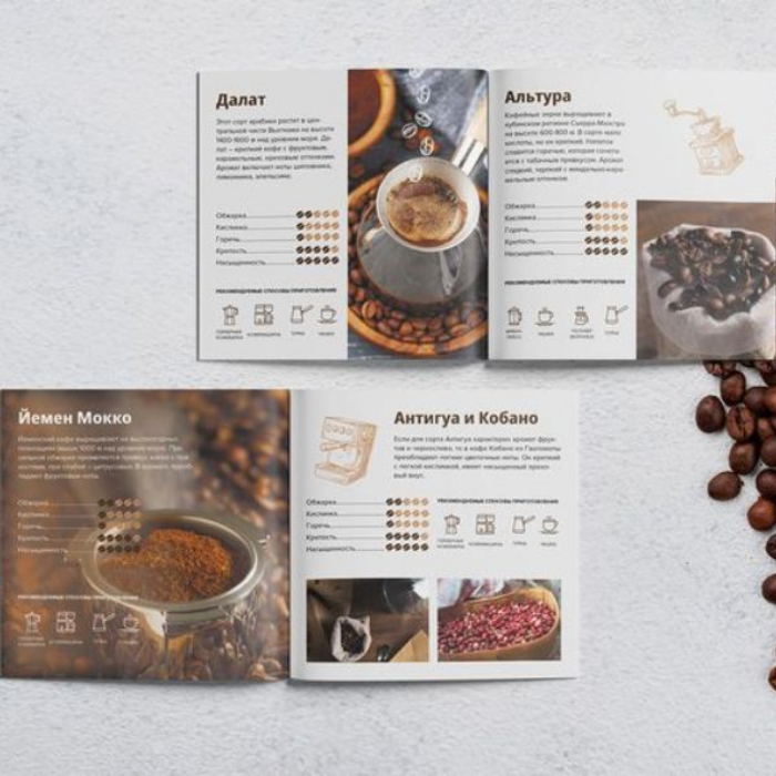 Catalogue coffee là ấn phẩm quảng cáo dạng cuốn (sách mỏng hoặc gập), dùng để giới thiệu các dòng sản phẩm cà phê mà thương hiệu đang cung cấp. Nội dung thường bao gồm: