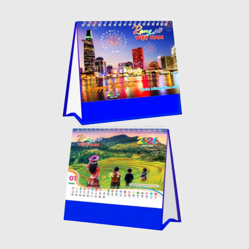 Lịch để bàn: Là sản phẩm được thiết kế với 13 tờ tương ứng với 1 tờ bìa và 12 tờ ngày tháng trong năm. Kích thước nhỏ gọn, chủ yếu sử dụng để trên bàn làm việc và kệ trưng bày… Không chỉ đơn thuần là xem ngày giờ mà còn là bức tranh trang trí sinh động nơi làm việc, tạo cho người dùng cảm giác thoải mái sáng tạo trong công việc. Đặc biệt ghi chú lại các cuộc họp quan trọng, những ngày kỉ niệm của người thân hay những lịch trình dự tính trong tương lai v.v…Thuận tiện trong công việc mà không sản phẩm nào thay thế được.