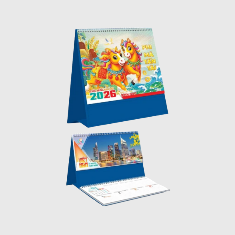 Lịch để bàn: Là sản phẩm được thiết kế với 13 tờ tương ứng với 1 tờ bìa và 12 tờ ngày tháng trong năm. Kích thước nhỏ gọn, chủ yếu sử dụng để trên bàn làm việc và kệ trưng bày… Không chỉ đơn thuần là xem ngày giờ mà còn là bức tranh trang trí sinh động nơi làm việc, tạo cho người dùng cảm giác thoải mái sáng tạo trong công việc. Đặc biệt ghi chú lại các cuộc họp quan trọng, những ngày kỉ niệm của người thân hay những lịch trình dự tính trong tương lai v.v…Thuận tiện trong công việc mà không sản phẩm nào thay thế được.