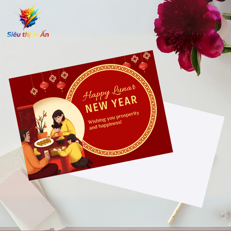 - Thiệp Tết, thiệp Chúc mừng năm mới là thiệp gập, mặt trong thiệp để trắng để bạn ghi lời chúc hoặc in logo doanh nghiệp