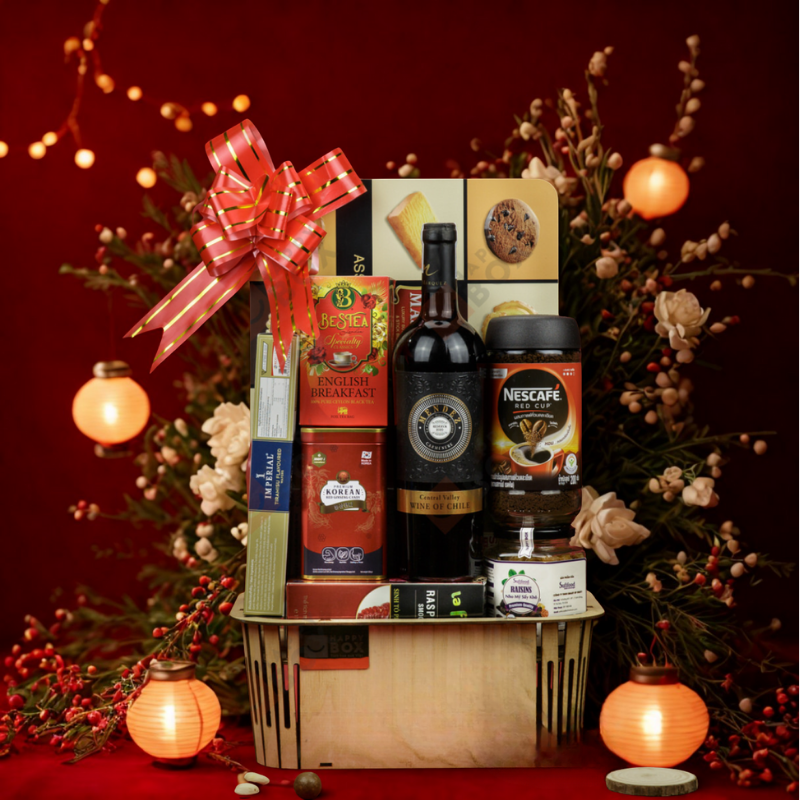 Giỏ quà Tết được thiết kế sang trọng, bắt mắt với những chi tiết tinh xảo, phản ánh sự chăm chút tỉ mỉ từ nhà sản xuất. Màu sắc chủ đạo là đỏ và vàng – hai gam màu mang lại may mắn và tài lộc, đồng thời gợi nhớ đến không khí rộn ràng của Tết. Bên trong giỏ quà là sự pha trộn hài hòa giữa các món ăn ngon, thức uống bổ dưỡng và những món đồ trang trí tinh tế.