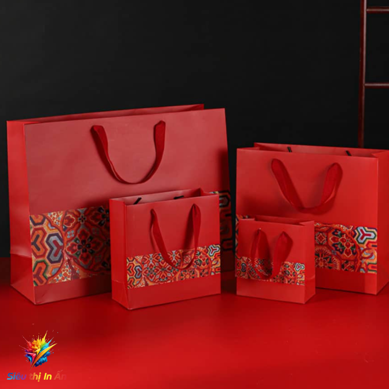 Túi Giấy Couche In Màu Đặc Sắc: Kích thước linh hoạt từ cỡ nhỏ (đựng chai rượu) đến cỡ lớn (set quà biếu), chất liệu giấy Couche bóng/mờ, in Offset 4 màu sắc nét các họa tiết Xuân độc quyền (hoa mai, hoa đào, linh vật năm...).