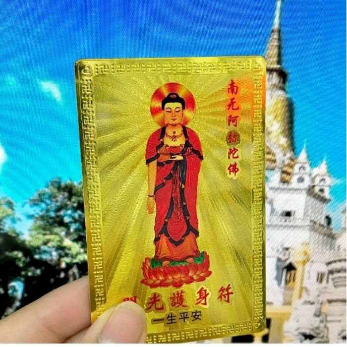 Thẻ Kim Bài Phật A Di Đà – Được chế tác tinh xảo từ kim loại cao cấp, khắc hình Đức Phật A Di Đà tượng trưng cho ánh sáng trí tuệ và lòng từ bi vô lượng. Mang ý nghĩa hộ thân, dẫn dắt tâm an, hướng thiện, giúp người đeo luôn được che chở và gặp nhiều may mắn. Thích hợp làm vật phẩm phong thủy hoặc quà tặng tâm linh ý nghĩa.