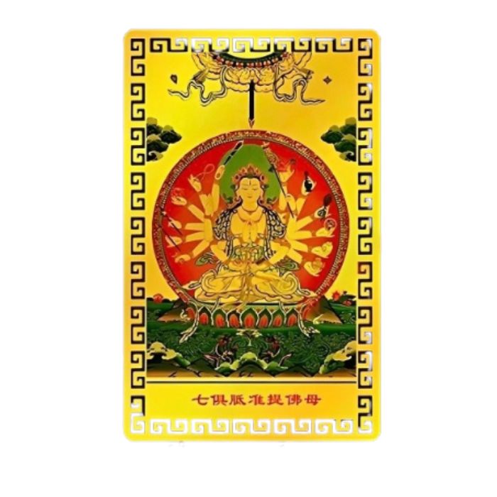 Thẻ Kim Bài Phật Mẫu Chuẩn Đề – Được chế tác tinh tế từ kim loại cao cấp, khắc hình Phật Mẫu Chuẩn Đề với 18 tay tượng trưng cho năng lượng gia trì và trí tuệ viên mãn. Mang ý nghĩa hộ thân, tiêu trừ nghiệp chướng và chiêu phúc lành, phù hợp mang theo bên mình hoặc làm quà tặng phong thủy thiêng liêng.