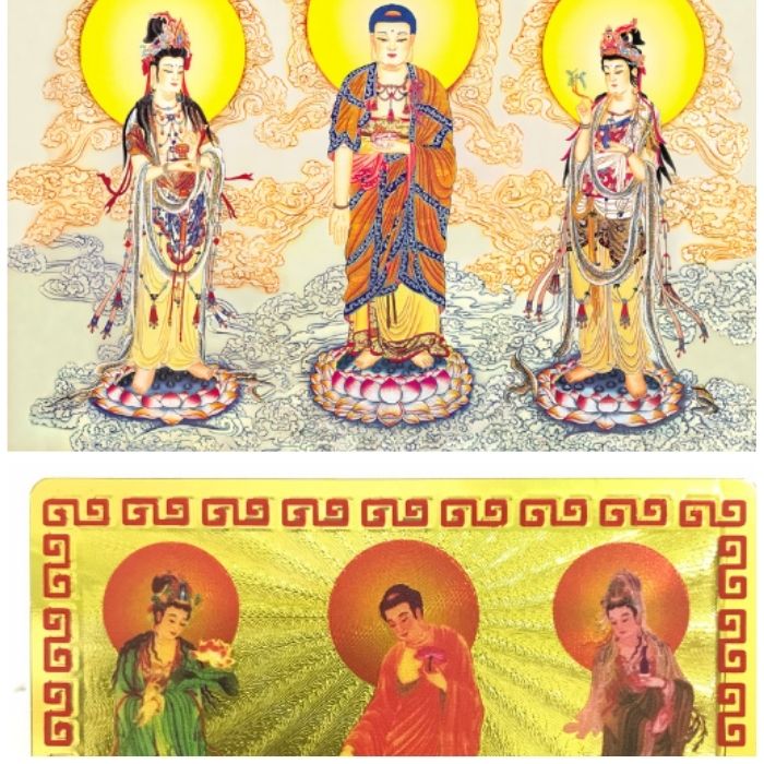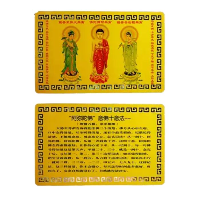 Thẻ Kim Bài Tây Phương Tam Thánh Phật – Thiết kế trang nghiêm, khắc họa hình tượng A Di Đà Phật, Quan Thế Âm Bồ Tát và Đại Thế Chí Bồ Tát. Biểu trưng cho lòng từ bi, trí tuệ và cứu độ, mang lại bình an, may mắn cho người sở hữu. Thích hợp mang theo bên mình hoặc làm quà tặng tâm linh ý nghĩa.